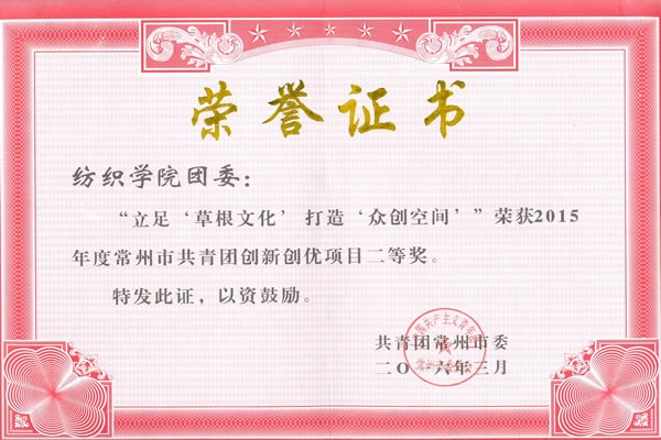 3月(yuè)23日(rì),共青團常(cháng)州市委十五屆四次(cì)全體(擴大)會議(yì)順利召開,會(huì)議(yì)總(zǒng)結了2015年常州(zhōu)市共青團工作,並部署了2016年的任務。在會議上,我院團委獲得“2015年度常州市優秀團委”榮譽(yù)稱號,共青(qīng)團創新創優項目《立足“草根文化(huà)”,打造“眾創空間”》榮獲常州市共青(qīng)團創新(xīn)創優(yōu)項目二等獎。