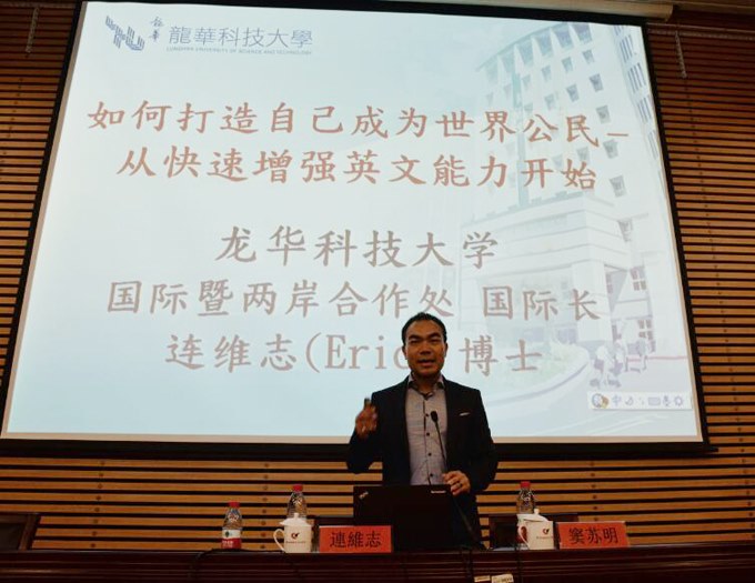 在圖(tú)書館報告廳(tīng),連維誌博士向(xiàng)學生(shēng)們介紹了台灣龍華科技大學及其辦學理念,並開(kāi)展了題為“如何打造自(zì)己(jǐ)成為世界公(gōng)民——從快速增(zēng)強英文能力開始”的專題講座,同學們反響熱烈,紛紛表示頗受啟發。