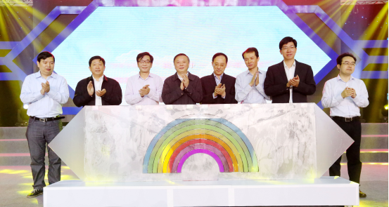 省人設廳勞動就業管理中心副調(diào)研員陶星(左一)、我院黨委書記鄧誌良(左二)、省科協副巡視員楊文新(左(zuǒ)三)、中共常州市委常委、科教城黨工委書記徐光輝(左四)、省經濟和信息化委員會副主任龔懷進(右四)、團省委黨組成員、省少先隊總輔導員薑東(右三)、我院院長王丹中(右(yòu)二)以及共青團常州市(shì)委書記潘文卿(右一(yī))等領導上台共同啟動開幕儀式(shì)。七色水匯聚成一道彩虹,蘊含著對大賽的美好寓(yù)意,也對(duì)青年寄予(yǔ)了創出美(měi)好人生的期望。