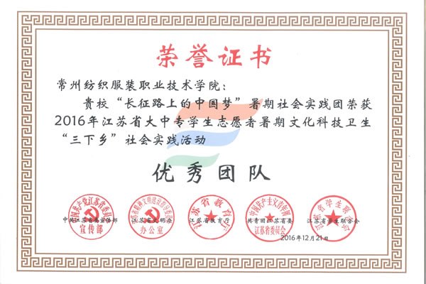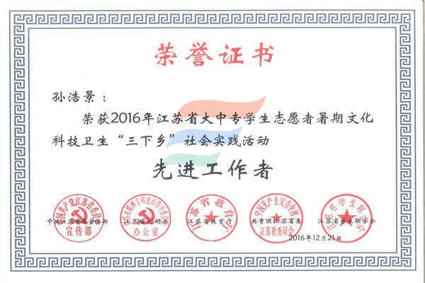 日前(qián),中共江蘇省委宣傳部、江蘇省文(wén)明辦、江蘇省教育廳、共青團(tuán)江(jiāng)蘇省委、江蘇(sū)省(shěng)學生(shēng)聯合會聯合發(fā)文,表彰2016年全省大中專學生誌願者暑期文化科技衛生(shēng)“三下鄉”社會實踐活先(xiān)進集體和個人,我院“長征路上的中國夢”暑(shǔ)期社會實踐團榮獲優秀團隊,孫浩景榮獲先進工作者、曹傑榮獲先進個人。