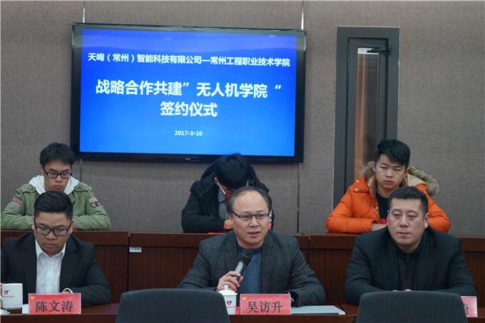 3月10日下午,我院與天峋(常州(zhōu))智(zhì)能科技有限(xiàn)公司在圖書館12樓第二會議室舉行戰略合作共建“無人機(jī)學院(yuàn)”簽約儀式。常州科教城管委會路琦副主(zhǔ)任、常州科教(jiāo)城管委會移動互(hù)聯網產業園何超主任、常州科教城管委會科技處吳嘉祿處長、天(tiān)峋(常(cháng)州)智能科技有(yǒu)限公司陳文濤(tāo)總經(jīng)理等(děng)一行(háng)、院長吳訪升教授、校企合作辦(bàn)公室周勇主任、信(xìn)息學院馬永山院長(zhǎng)出席此次簽約儀式(shì)。出席(xí)活動的還有學院相關領導和信息學院相(xiàng)關專業部分師生代(dài)表。簽約儀式由周勇(yǒng)主任主持。