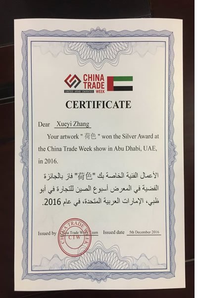 近日傳來喜訊,我院張學義老師的兩幅(fú)紮染作(zuò)品(pǐn)《月色(sè)》、《荷色》在(zài)沙特阿拉伯阿布紮比(bǐ)舉行的中國國際貿易周展(zhǎn)會上分別獲得金、銀獎。