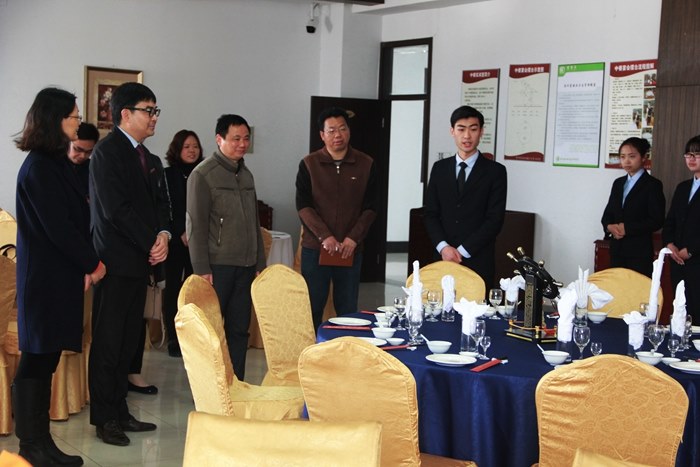王誌平(píng)副院長帶領來賓參觀了學院模擬中餐(cān)廳、模擬導遊(yóu)實訓(xùn)室、模擬客房(fáng)實訓室等實訓基地。旅遊係(xì)主任周麗向來賓詳細介紹了各個(gè)實訓室(shì)的功(gōng)能布局、教學設備、實訓計劃等。來賓觀看了(le)旅遊係主題開(kāi)夜床設計、主題宴會台麵設計、茶藝(yì)表演及(jí)模擬導遊(yóu)講解(jiě),對旅遊係的辦學特色給(gěi)予充分(fèn)肯定。