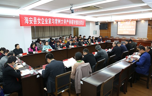 3月30日下午,海安縣(xiàn)縣委常委、宣傳部部長嚴長江,海安(ān)縣婦聯主席盧禮華,海安縣科技(jì)局黨組書記趙愛玲,海安縣女(nǚ)企業家協會會長、海安鷹球集團有限公司董事長申承秀等一行40多(duō)人來校進行海安縣女企業家—常州大學產(chǎn)學研對接(jiē)洽談。常州大學副校長蘇旭平出席交流會,產(chǎn)學研合作處、教務處、相關學院科研負責人、入駐海安(ān)研究院團隊代表參加了會(huì)議。