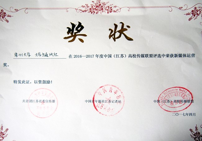 近日,2017中國(江蘇)高校傳媒聯盟年會在南京理工大學召開,常州大學大學生通訊社作為中國(江(jiāng)蘇)高(gāo)校(xiào)傳媒聯盟注冊的會員媒體與兄弟聯盟成(chéng)員、全省39家高校的(de)近120位校媒和社團代表一起參加此次會議。會議頒發了十佳校園(yuán)媒體獎、新媒體運(yùn)營獎等獎項,我校大(dà)學生通訊社獲中國(江蘇)高校傳媒聯盟新媒體運營獎,全省共有(yǒu)10所學校校園媒(méi)體(tǐ)獲評此獎。