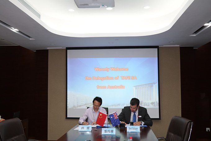 洪霄副院長與布萊特(tè)·默哈尼副校長代(dài)表兩校簽署(shǔ)了合作備忘錄。雙方(fāng)就合作項目進行深入(rù)洽(qià)談。人事(shì)處葉(yè)愛英副處長與澳方就我院教師(shī)2017年赴南(nán)澳研修方案的具體事宜進行了交流與探討。澳中友好發展協會理事滕宇超先(xiān)生代表協會給管衛東頒發(fā)了“名譽顧問”的聘書。