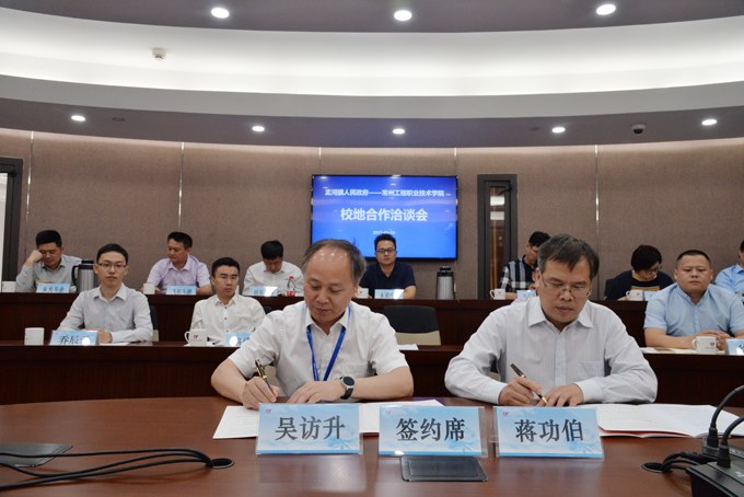 常州先進製造技術成(chéng)果展示洽談會至今已連續舉辦了十二屆,作為2017年專題活動之一,5月19日上午,學院與孟(mèng)河鎮人民(mín)政府校地合作協議簽字儀式在圖文信息大樓第二(èr)會議室舉行。孟河鎮黨委副書記、鎮長蔣功伯率有關單位負責人、孟河鎮15家規模以上企業代表參加簽約儀式。學院化工學院、機電學院、信息(xī)學(xué)院、經管學院等二級學院(yuàn)負責人,人事處、教務處、繼教院等職能部門負責人和(hé)部分教師代表共同參加了此次活動。學院吳訪升院長出席簽約儀式並致歡迎(yíng)辭(cí),活動由科技處處長周勇主持。