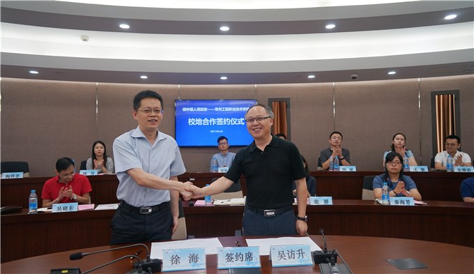 6月16日上(shàng)午,繼我(wǒ)院與孟河鎮(zhèn)校地合作協議達成後,我院又(yòu)迎常州工業(yè)重鎮橫林鎮鎮長一行來訪,共商(shāng)校地合作事宜。與橫林鎮人民政府校地合作簽約儀式在我(wǒ)院圖文信息大樓12樓第二會議室舉行,橫林鎮鎮長徐海、院長吳訪升出席簽約儀(yí)式。同時,橫林鎮江蘇協和電子股份有(yǒu)限公司與我院信息(xī)學院、江蘇賽拉弗光伏係統有限公司與我院化工學院順利簽約。簽約儀式(shì)由科技(jì)處處長(zhǎng)周勇主持。