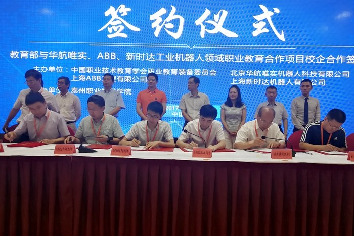 6月26日,教育部工業機器人(rén)校企合作項目簽約會在(zài)泰州舉行。教育部職成司(sī)、教育廳高教處、泰州市政府、中國職業(yè)技術教育裝備委員會、合作企業等領導出席會議。根據教(jiāo)育部(bù)《關於公布華航唯實、ABB、新時達工業機(jī)器人領(lǐng)域(yù)職業教育項目合(hé)作院校名單(dān)的通知》(教職成司函[2017]14號),按照“成熟一批,簽約一批,啟動一(yī)批”的要求,我院做為第一批項目合作院校(xiào)參(cān)加了簽約會,院長楊(yáng)勁鬆代表(biǎo)我院在簽(qiān)約儀式上簽約。