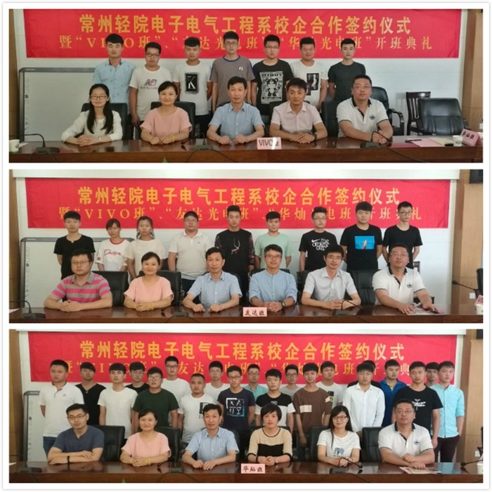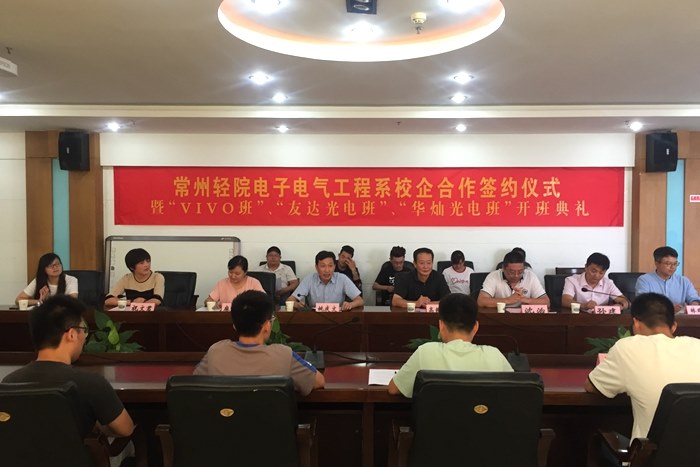 7月3日上午(wǔ),我(wǒ)院電子電氣工程係(xì)校企合作簽約儀式暨“VIVO班”、“友達光電班(bān)”、“華燦光電班”開班典禮隆重舉行。江蘇百勝電子有限公司、友達光電(昆山)有限公司、華燦光電(蘇州)有限公司(sī)聯手電(diàn)子係進行深度合作,全麵提升人才培養質量。