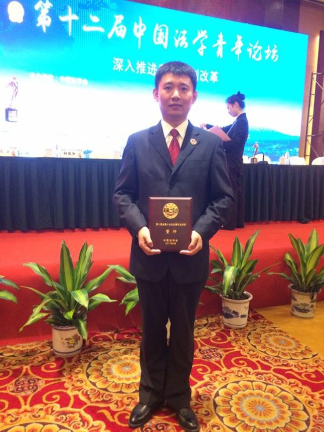 8月17日,第(dì)八屆(jiè)“全(quán)國十大傑出青年法學(xué)家(jiā)”座談會(huì)在北京召開,常州大學特聘教授董坤作為傑出(chū)青年法學(xué)家之一,參加了座談會。中共中央政治局委員、中央政法委書記孟建柱會見了獲獎(jiǎng)者及提名獎獲得者,並勉勵(lì)大家認真學習(xí)領會習近平總書記係列重要講話精神,立時代之潮頭、通古今之變化、發思想之先聲,爭做法學理論創新的開路人(rén)、法治中國建設的(de)排頭(tóu)兵,為建設社會主義(yì)法治國家(jiā)作出新的更大(dà)貢獻。8月19日,董坤在江蘇省徐州市召開的第十二屆中國法學青年論壇(tán)上接受“全國十大青年法學家”頒獎,並作了題為“牢記使命,砥礪奮進——做一名法治中國的踐行者、捍衛者、探(tàn)索者”的學術演講。