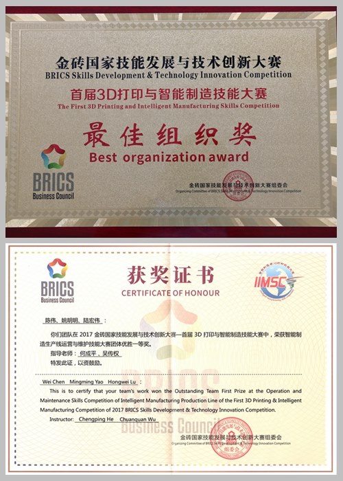 據悉,本次大賽有來自全國68家本科和高(gāo)職院校,以及南非和(hé)俄羅斯等共200多名選手(shǒu)參賽角逐競(jìng)技場。我院參(cān)賽團隊從參賽的44所高職學院(yuàn)的132名選手中脫穎而出,奪得2017金磚國家技能發展與技術創新(xīn)大賽——首屆3D打印與智能製造技能大賽“智(zhì)能(néng)製造(zào)生產線運(yùn)營與維護技能(néng)大賽(sài)”團體(tǐ)優勝一等獎(jiǎng)。