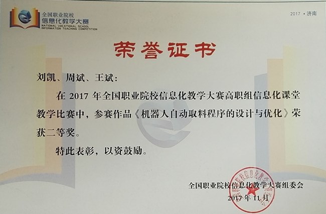 電氣工程學院教師劉凱、周斌、王斌的參賽作品《機器人自動取料(liào)程序(xù)的設計與優化》榮獲高職組信息化課堂教學比賽二等獎。