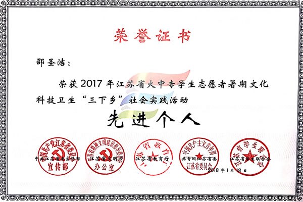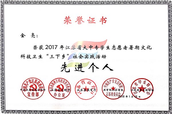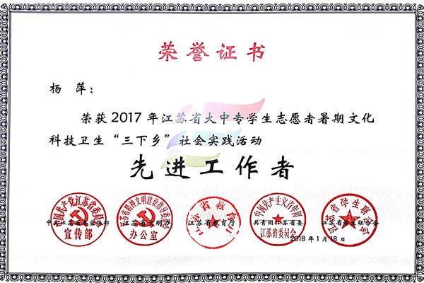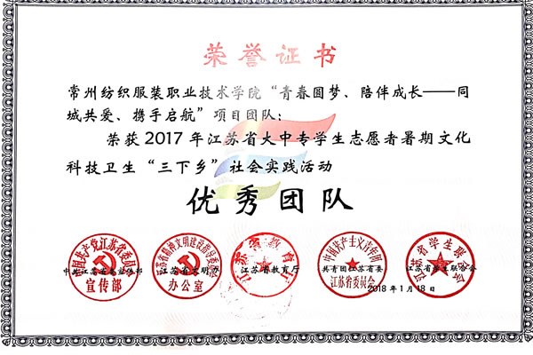 近日,省委宣傳部、省教育廳、共青團省委對(duì)在(zài)2017年江蘇省大(dà)中專學生誌願者暑期文化科技衛生“三下(xià)鄉”社會實踐活動中表(biǎo)現優秀(xiù)、成績突(tū)出的單位、團(tuán)隊(duì)和個人進(jìn)行(háng)了表彰。常州紡織服裝職業技術(shù)學院團委榮獲(huò)2017年江蘇省大中專學(xué)生誌願者(zhě)暑期“三下鄉”社會實踐(jiàn)活動先進單位稱號(hào),“青春(chūn)圓夢、陪伴成長——同城(chéng)共愛、攜手(shǒu)啟航”項目團隊榮獲優秀(xiù)團隊稱號,楊萍榮獲先(xiān)進工作者,邵聖潔、金亮兩位(wèi)同學獲先進個人稱號。