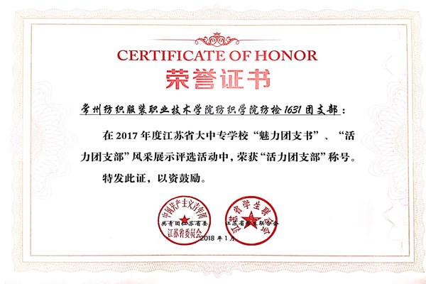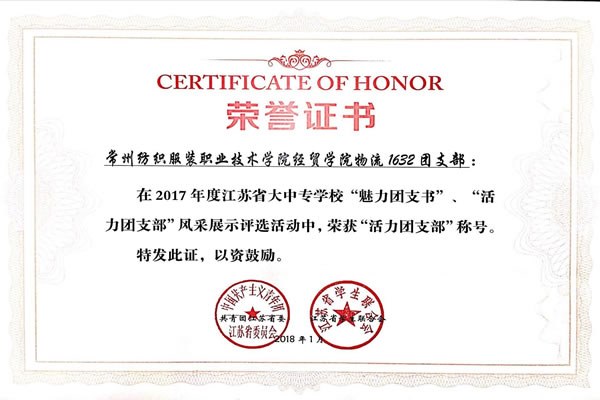 近日,我校再次獲得共青團江蘇省委、江蘇省學(xué)生聯合(hé)會表彰,其(qí)中物流1632團(tuán)支部、紡檢1631團支部在江蘇省2017年度全(quán)省(shěng)大中專學校“魅力團支書、活力團支部(bù)”展評活動中(zhōng)喜獲江蘇省“活力團支部”榮(róng)譽稱號,營銷1531班劉維同學(xué)在(zài)“我的青(qīng)春故事報告會”活(huó)動中獲評為江蘇省大學生“校園(yuán)青春榜樣”。