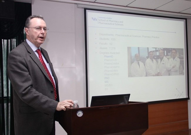 來訪期間,O'Donnell一(yī)行與製藥學院具體商談了藥學科學碩士和臨床藥學博士兩個研究生項目合作培養計劃,並(bìng)與製藥學院簽署了“4+2”藥學科學碩士及“4+4”或(huò)“4+1+4”臨床藥學博士(shì)培養合作協議,O'Donnell向(xiàng)製藥學院師生詳細介紹了布法羅藥學(xué)院藥(yào)學科學(xué)碩士和臨床(chuáng)藥學博(bó)士兩個研究生項目(mù)及相關學科師生和科研概況;張漢霆(tíng)作了題為“老(lǎo)年性癡呆伴抑(yì)鬱:靶向磷酸二酯(zhǐ)酶(méi)的治(zhì)療作用及其機製”的學術報(bào)告,並介紹了他們一行三人合(hé)著的、國際最大出版社Springer出版的新書《Phosphodiesterases: CNS Functions and Diseases》(《磷酸二酯酶:中樞神經係統功能和疾(jí)病》);O'Donnell一行還與製藥學(xué)院相關課題組進行了在研合作課題——PDE抑製劑類退行性疾病藥物研發的交流與指導,並製定了詳細的年(nián)度研發計劃和成果規劃。