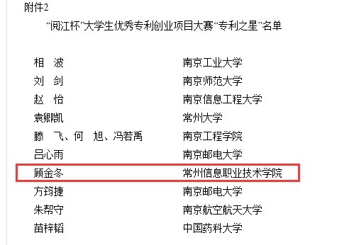 我校機電工程學院塗琴老師指(zhǐ)導的(de)學生創業項目(mù)“激(jī)光對射式工業機械手工作(zuò)點坐標示教工具及其示教方法”,獲江蘇省(shěng)“閱江杯”大學生優秀專利創業(yè)項目大賽(sài)三等獎,發明人顧金冬獲全省高職唯一的“專利之(zhī)星”。