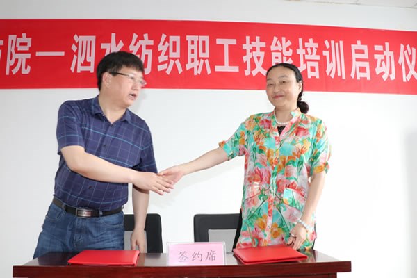 活動(dòng)儀式上,蔣(jiǎng)心亞院長與泗(sì)水紡織董事長盛睦良(liáng)簽訂了合作(zuò)協議;張(zhāng)文明代表學校講話;韓平(píng)副(fù)會長與張(zhāng)大江部(bù)長為項目揭牌。李林森主任闡述了精準對接項目的背景(jǐng),並稱讚合作為“促進產業工人收入增長,構建產業工人技能形成體係,完善產業工人評價、培(péi)養、構(gòu)成機製,以小項目啟步,打通泗陽可持續(xù)發展環節,為江蘇經濟發展(zhǎn)出(chū)力”作了(le)有效探索!