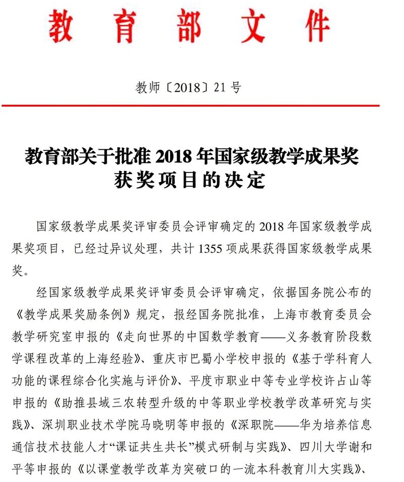 國家教學成果獎是(shì)按照教育部《教學成果獎勵條例》設立的教育(yù)教學研究和實踐領域最(zuì)高級別的業務類獎勵,每四年(nián)評審(shěn)一(yī)次。近年(nián)來,學校(xiào)堅持以學生為中心,以提高質量為核心,全麵推進專業(yè)建設(shè),促進(jìn)內涵式發展,持續深化教育教學改革,創新人才培養模式,取得了令人矚目的成績。