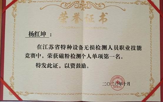 1027-30日,江蘇省特種設備無損檢測人員職業(yè)技能競賽在南京舉行。競賽由江(jiāng)蘇省市場監督管理局(jú)、江蘇(sū)省人力資源和社會保障廳、江蘇省總工會、共青團江蘇省委聯合主辦(bàn),江(jiāng)蘇省特種設備(bèi)安全監督檢驗研究院負責承辦,來自全省特種設備行業13支市級代表隊(duì)65名選手同場競技,經過公開、公平、公正的競(jìng)爭考核,我校理化測試與質檢技術專業(原無損檢測技術(shù)專業)2017屆畢業生(shēng)、南京金(jīn)鑫檢測(cè)工程責任(rèn)有限公司無(wú)損檢測員——楊紅坤榮獲磁粉檢測個人單(dān)項第一名,並被江蘇省人社廳授予“江蘇省技(jì)術能手”、被共青團江蘇省委授予“江蘇省青年崗位能手”(證書待發(fā))榮譽稱號。