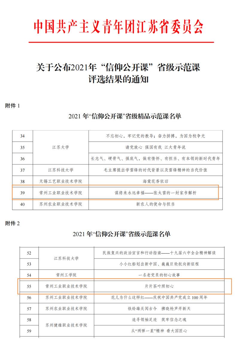 近日,共青(qīng)團江蘇省委公布了(le)2021年全省高校“信仰公開課”省級示範課評選結果,全省共40場“信仰公開課”省級精品示範課和62場“信仰公開課(kè)”省級示範課入選。常州工業職業技術學院的經貿管理學(xué)院(yuàn)副院長(zhǎng)張茵副教授(shòu)主講的《謀將來永遠幸福——張太雷的一封家書解析》獲評省級精品示範課,經貿管理學院禮(lǐ)儀社指(zhǐ)導老師肖婷玉主講的《片片茶葉(yè)照初心(xīn)》獲評省級示(shì)範課。